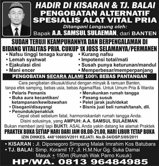 Kisaran – Telah Hadir di Daerah Kisaran dan Tanjung Balai Pengobatan Alternatif Spesialis Alat Vital Pria yang ditangani langsung oleh Bapak A.A. Samsul Sulaeman dari Banten.